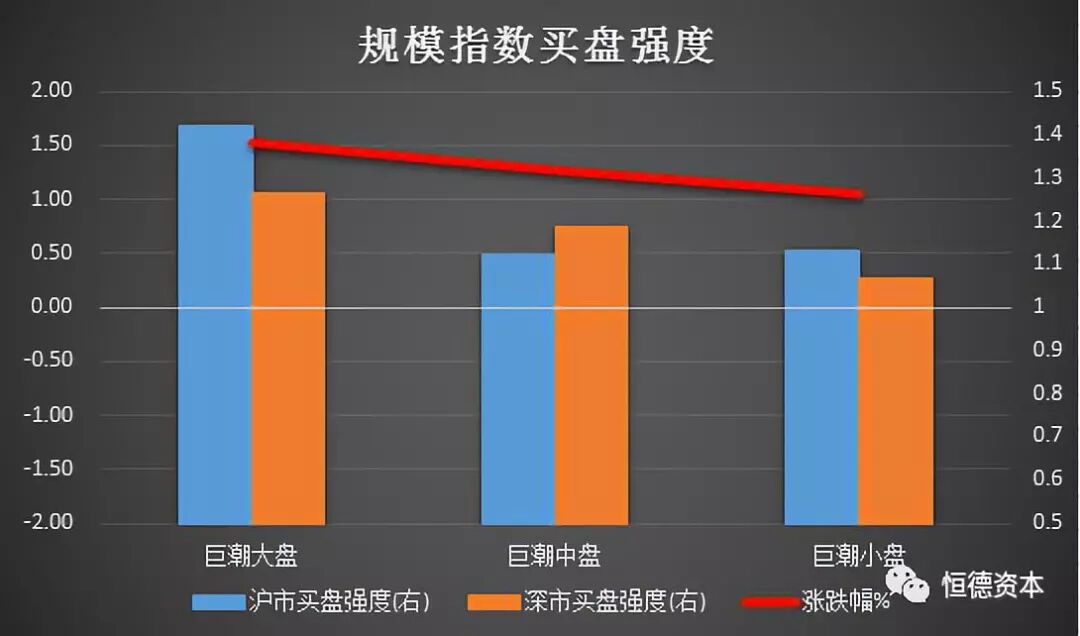 依据规模分类,规模指数中涨幅最大的是巨潮大盘,主动买盘意愿最强的是巨潮大盘。