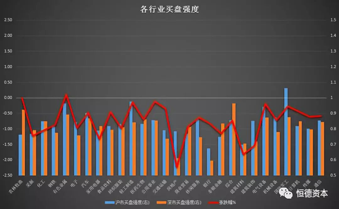 多维度观察各指数的涨幅与主动买卖盘强度,详见图二至图六,(用主动买盘与主动卖盘成交量之比定义为主动买盘强度,主动买盘强度为1表示主动买入成交量与主动卖出成交量相同;大于1表示主动买盘强度大于主动卖盘强度;反之亦然)。