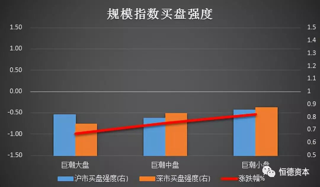 依据规模分类,规模指数中跌幅最小的是巨潮小盘,主动买盘意愿最强的是巨潮小盘。